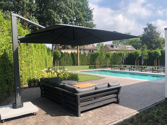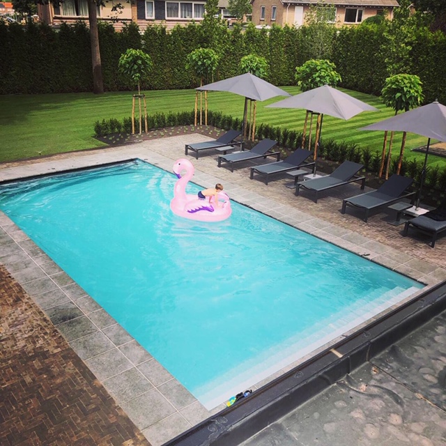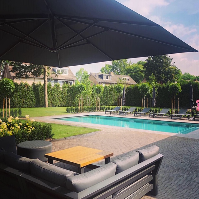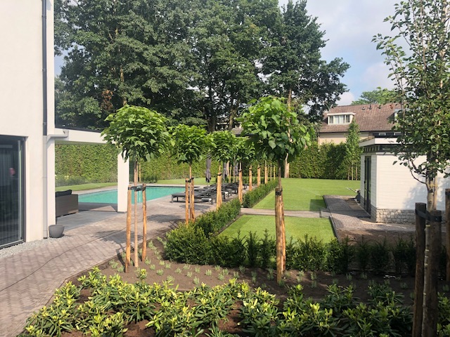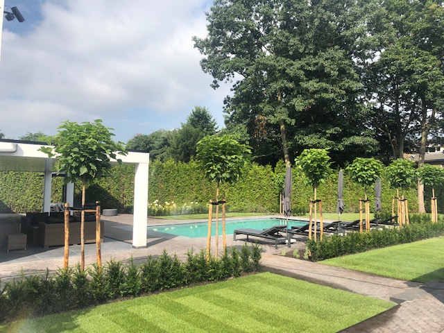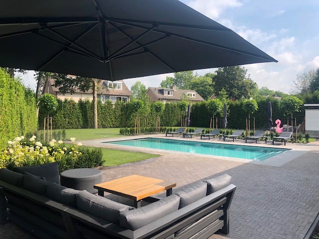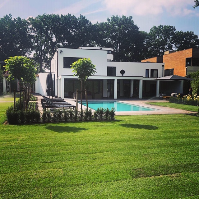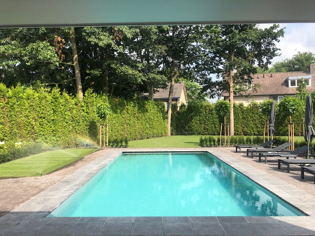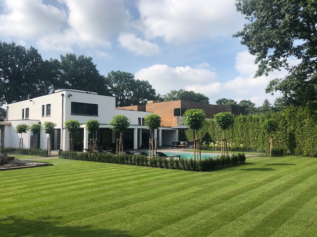 Deze strakke, moderne tuin hebben we net voor de zomervakantie 2019 mogen inrichten. Het gebruik van strakke lijnen, het mooie zwembad, de prachtige bomen, de beplanting en het frisgroene gras maakt het een plaatje!